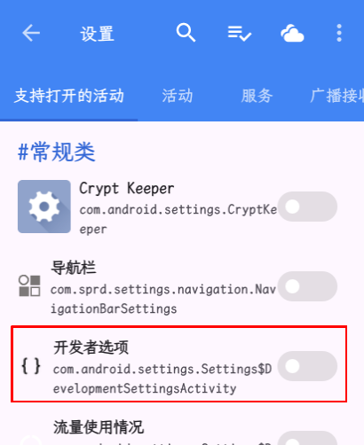 打开爱玩机工具箱,在应用功能中选择安卓的设置(com.android.settings)选择组件状态管理,然后打开开发者选项。