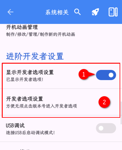 然后迅速回到爱玩机工具箱的导航页,选择系统相关,在里面打开开发者选项并进入。