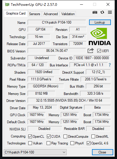 不过需要注意的是,P10X系列的计算卡都是砍了Pcie带宽的,比如P104的Pcie带宽只有1.0 x4,理论峰值是1GB/s,不过Pcie带宽并不影响跑图速度,顶多也就载入模型的时候慢一点。不过毕竟人家就一百多块钱,你还要什么自行车。